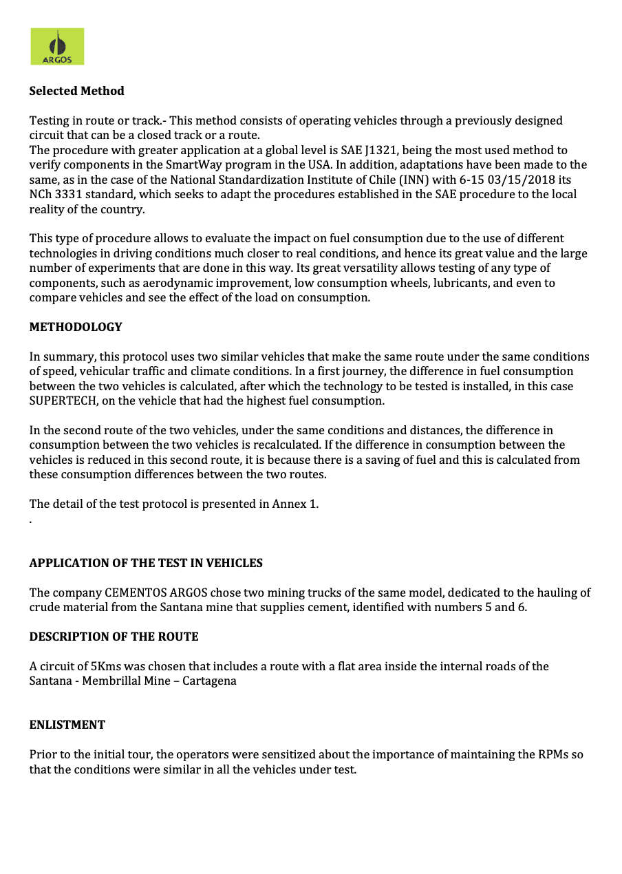 The Cementos ARGOS evaluation demonstrates that real-world, route-based testing using recognized comparative protocols can document meaningful fuel-consumption reductions in heavy mining vehicles.