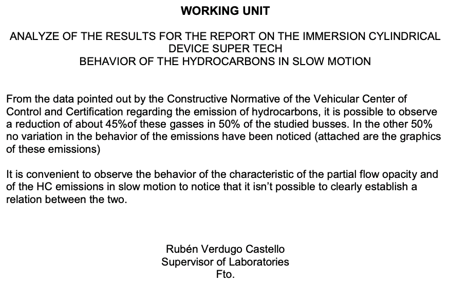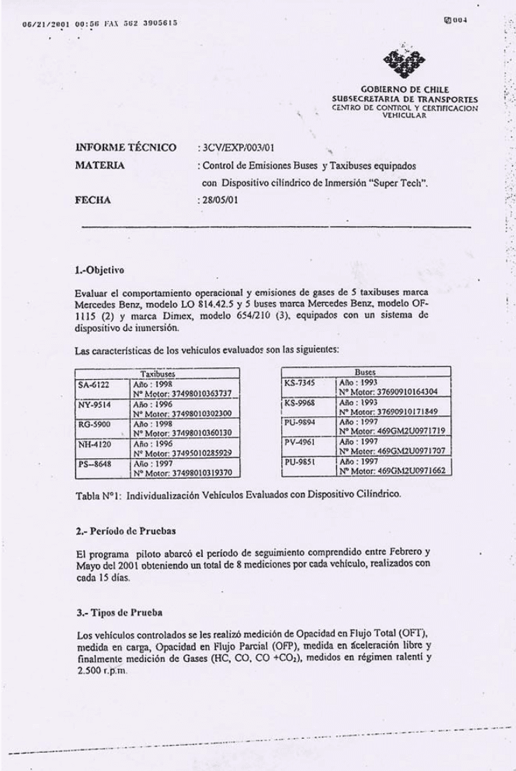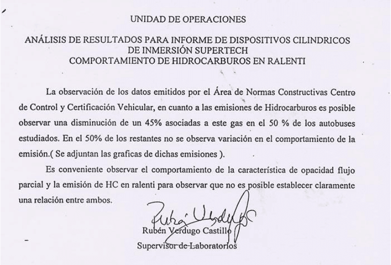 The Government of Chile, through the Undersecretariat of Transport and the Vehicular Control and Certification Center, conducted an official pilot evaluation program to assess the impact of the SuperTech® immersion device on exhaust emissions in public transport vehicles.