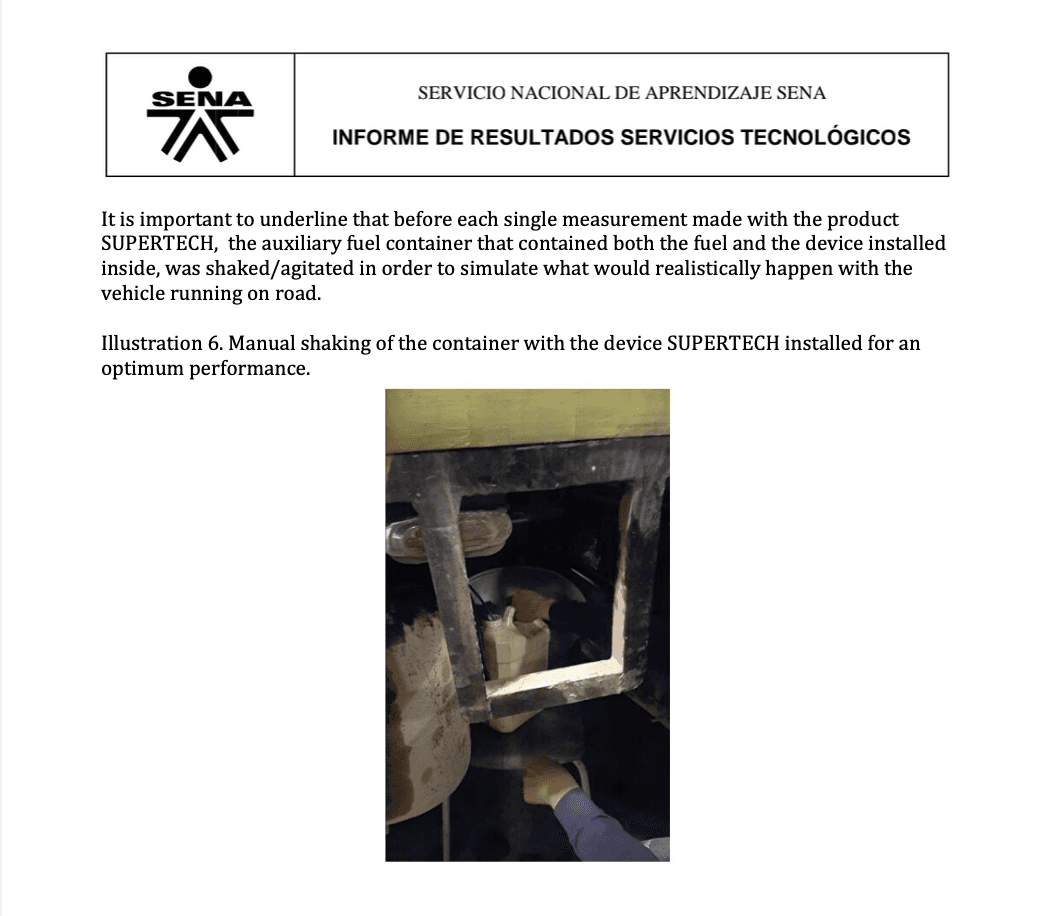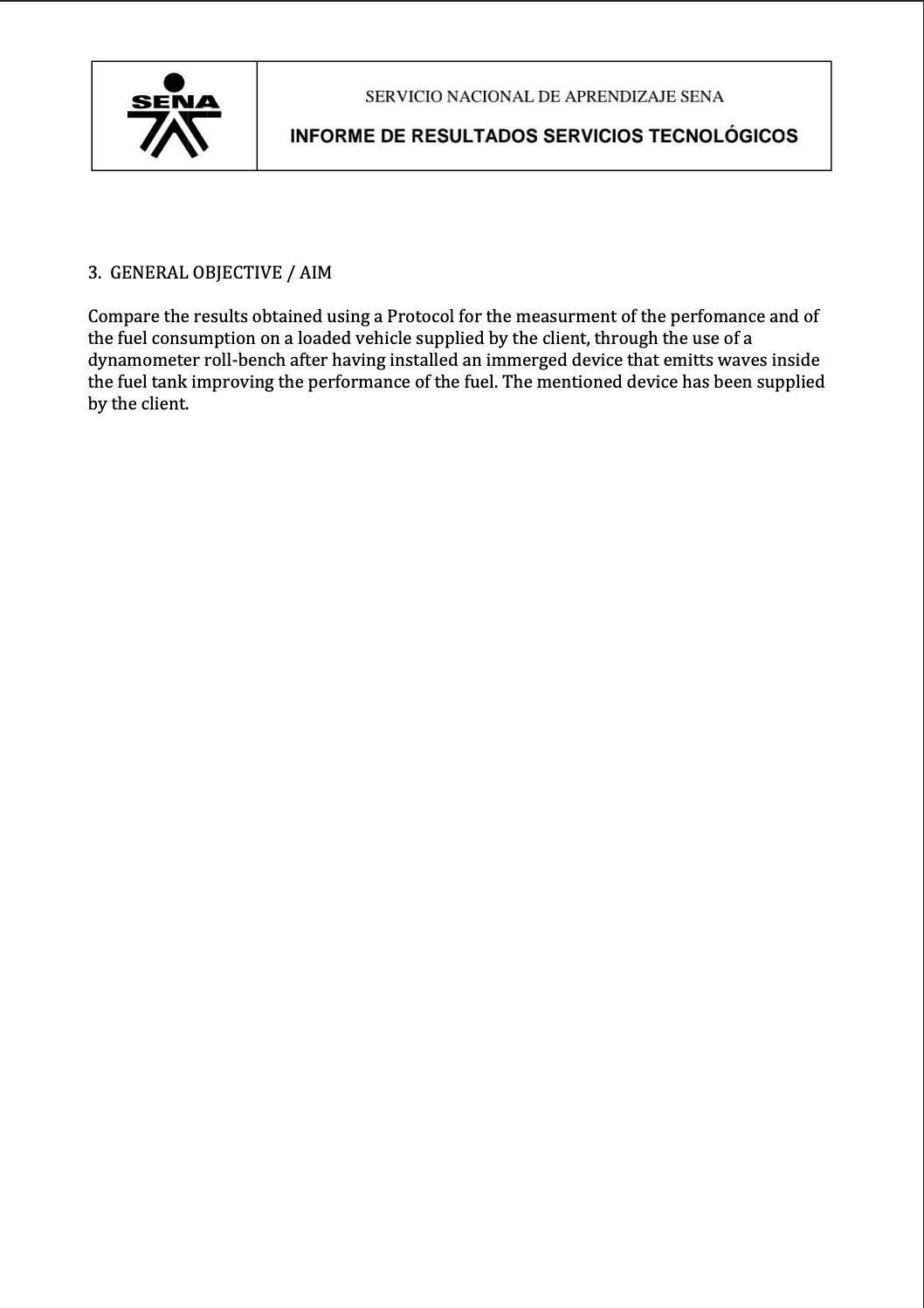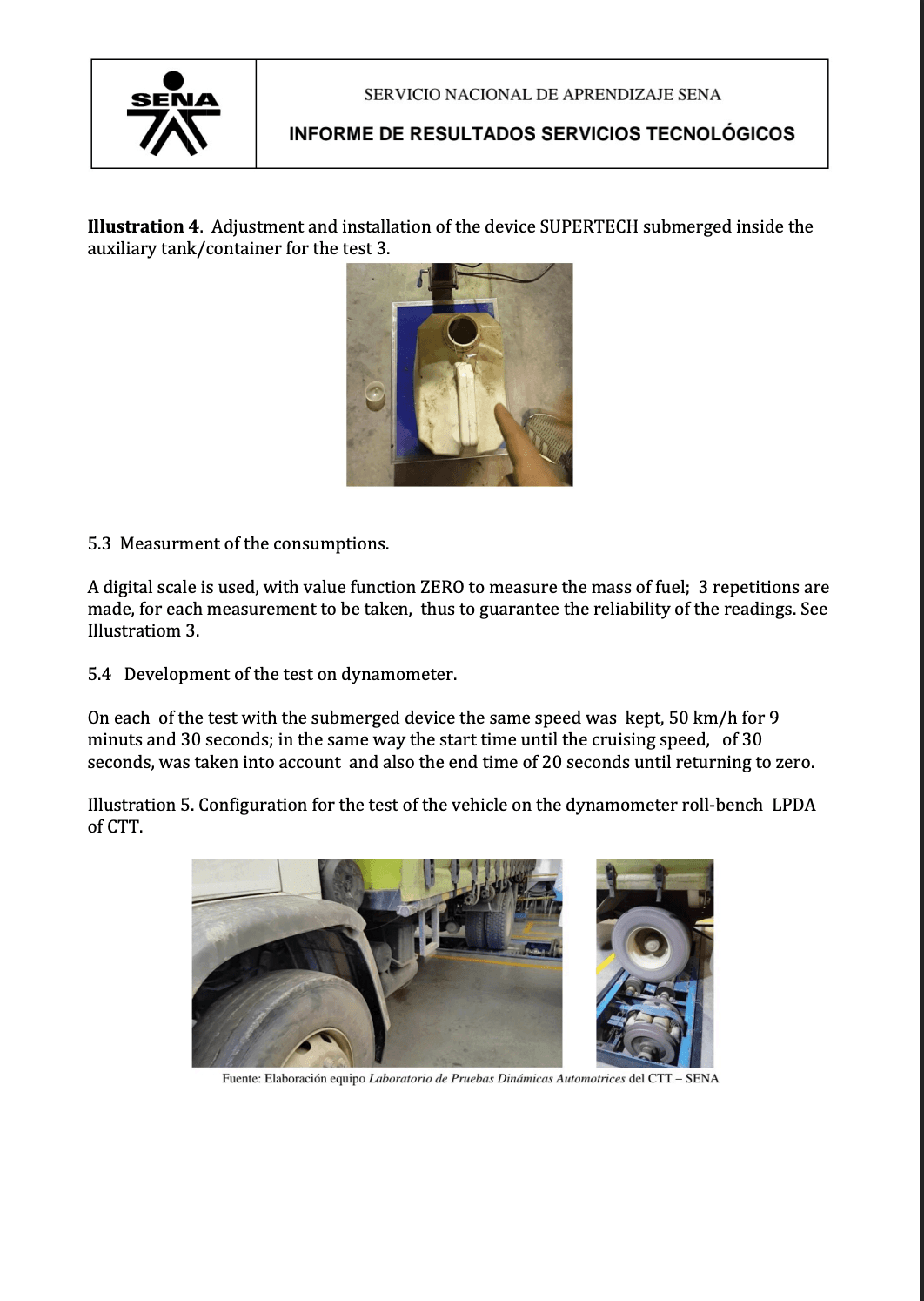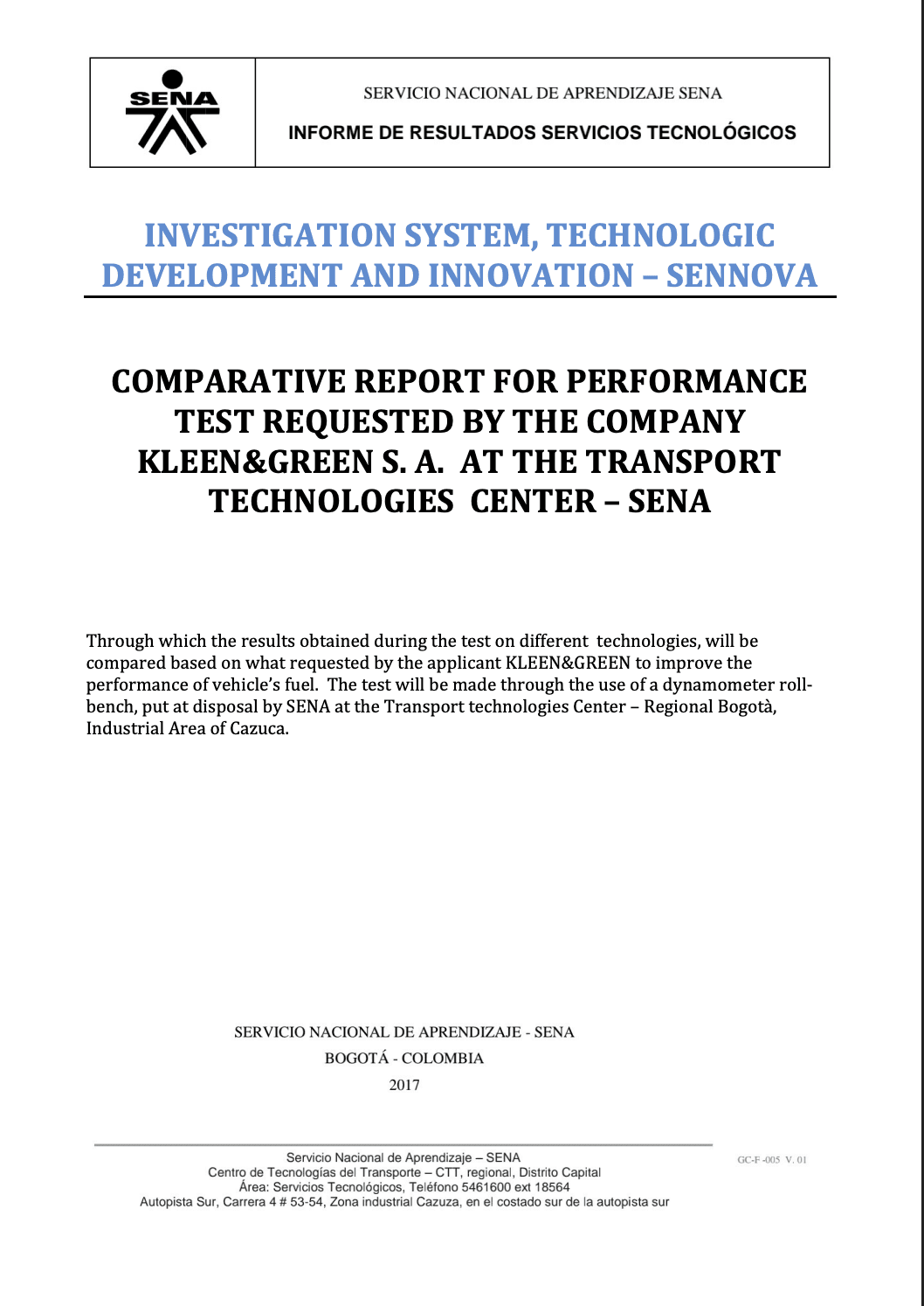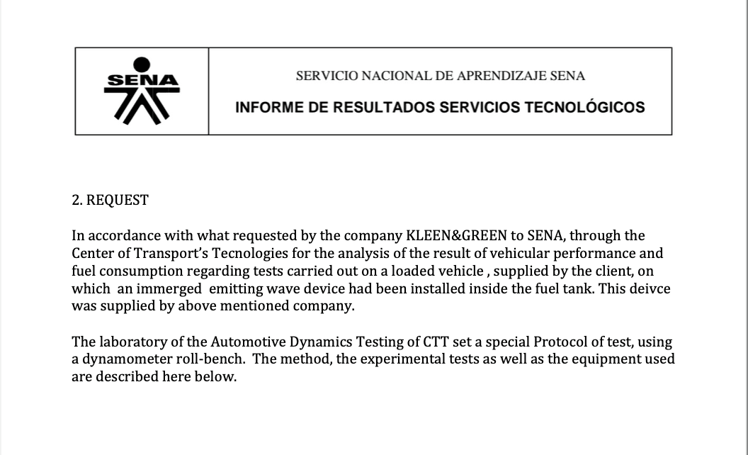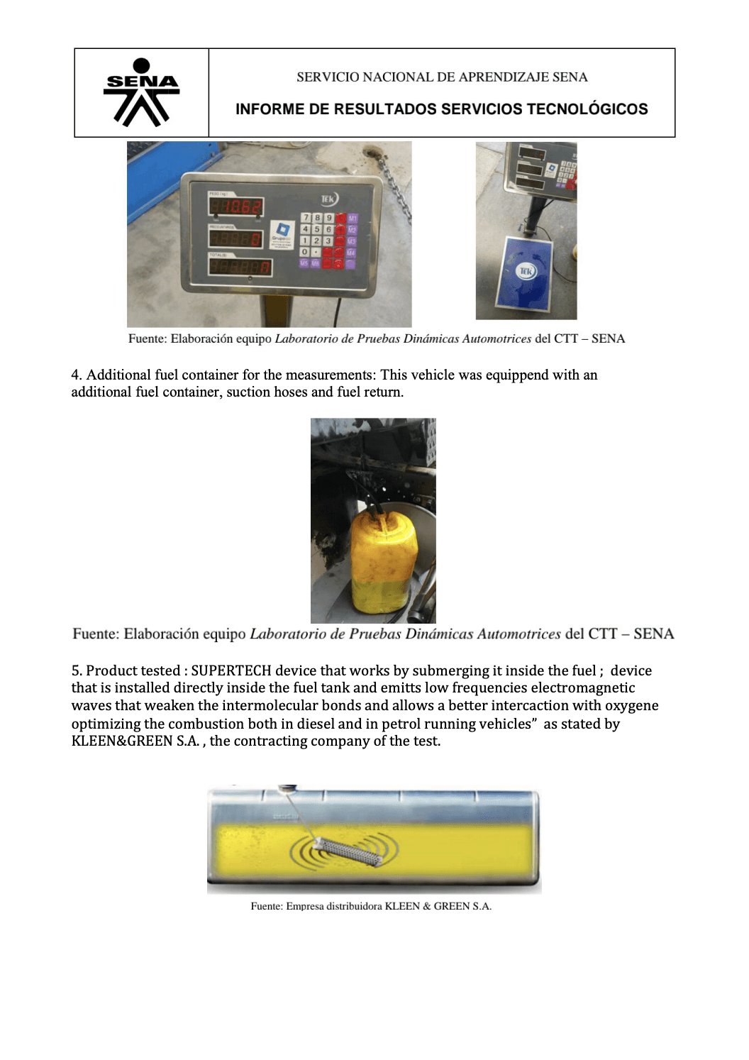 The Servicio Nacional de Aprendizaje (SENA), through its Transport Technologies Center (CTT) and SENNOVA research program, conducted a comparative laboratory evaluation to assess the impact of an upstream, in-tank fuel-conditioning device on vehicle fuel consumption and performance.