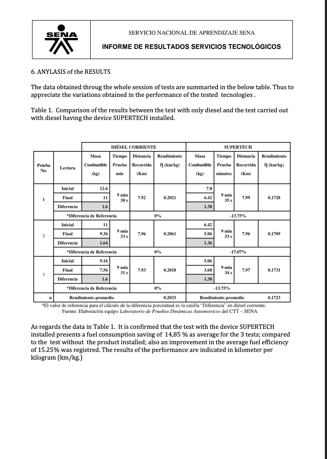 The report confirms that the observed fuel-consumption reduction was directly associated with the configuration in which SuperTech® was installed.