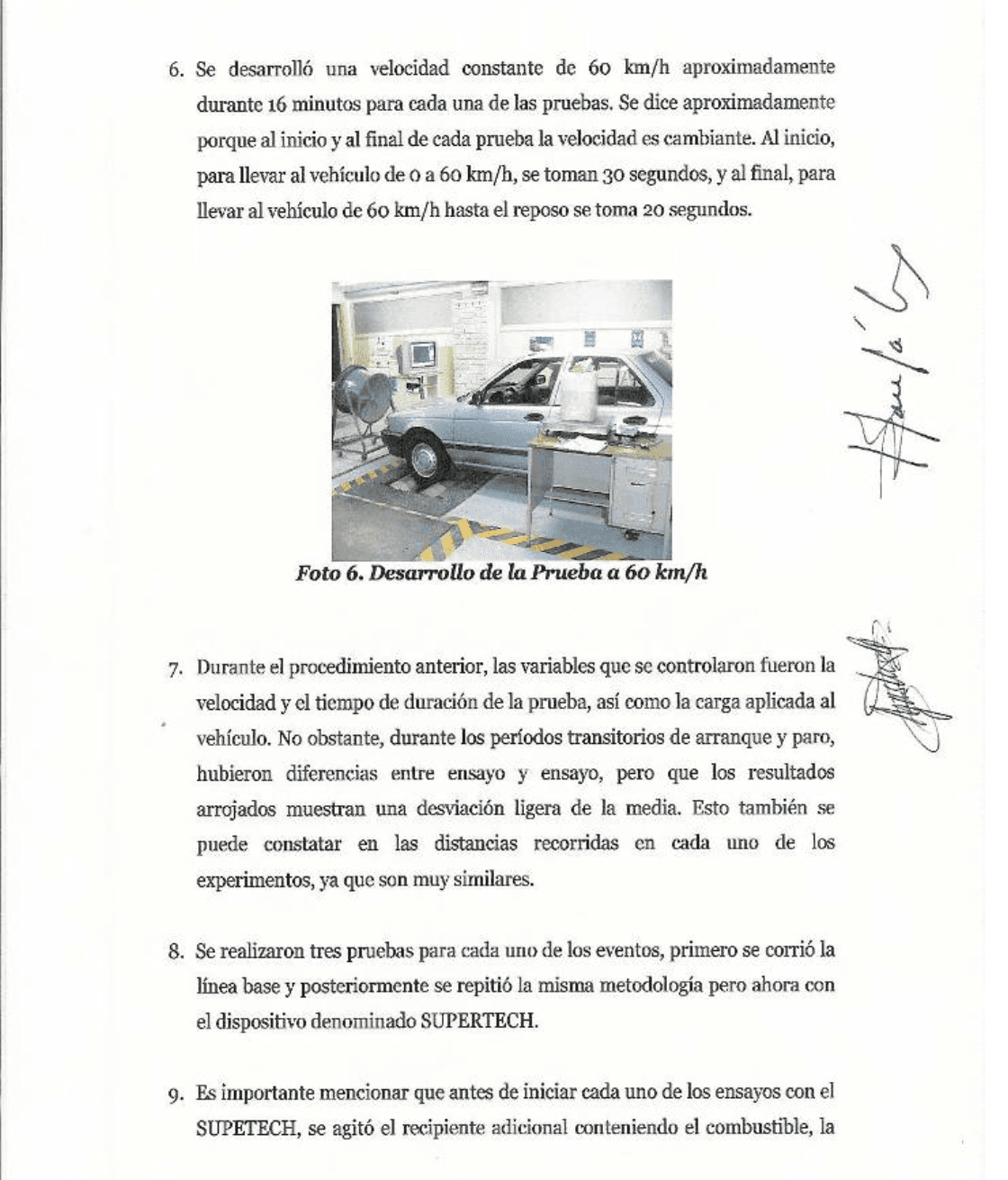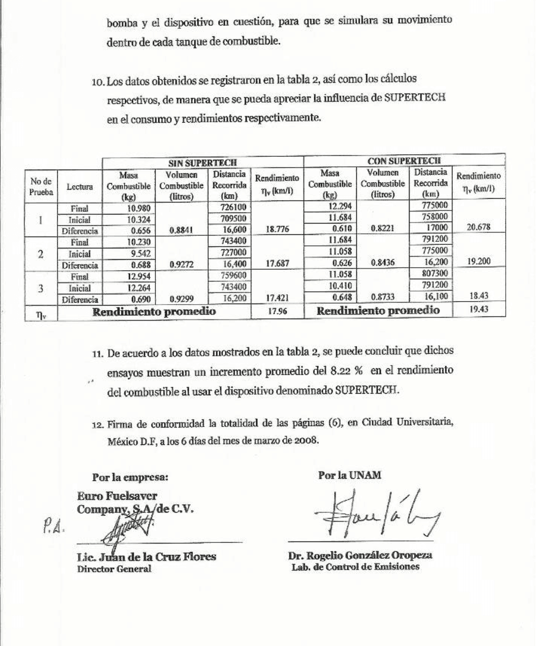 Across repeated dynamometer runs, the UNAM laboratory documented fuel-efficiency improvements ranging from approximately 8% on average to peak values of up to ~15% under specific test conditions when SuperTech was installed, compared to baseline operation without the device.